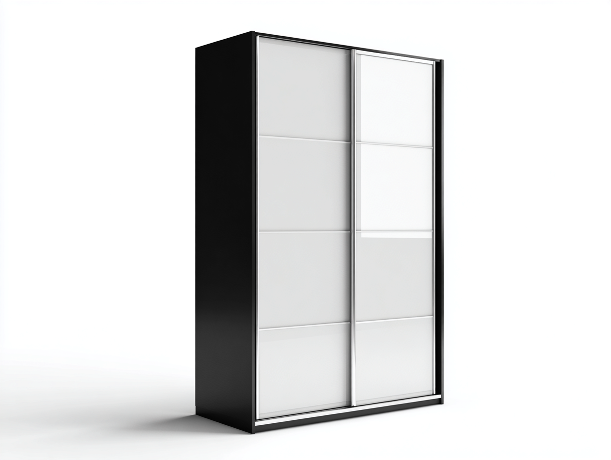 La estructura del armario está fabricada con paneles de madera resistentes que garantizan estabilidad durante el uso cotidiano. El acabado exterior combina paneles en color blanco con laterales en color negro, creando un contraste visual moderno y equilibrado. Las puertas correderas incorporan un sistema de guías que permite un desplazamiento suave y estable.