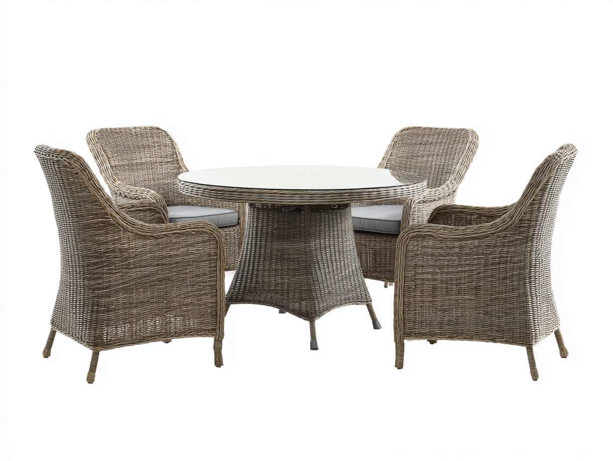 Este comedor de jardín está diseñado para crear un espacio cómodo y funcional en terrazas, patios y jardines. El conjunto incluye una mesa redonda y cuatro sillones de exterior que permiten organizar un área adecuada para disfrutar de comidas al aire libre o reuniones informales. El diseño con ratán trenzado y líneas equilibradas aporta una estética natural que se integra fácilmente en distintos entornos exteriores.