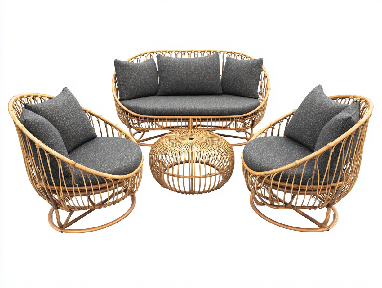El asiento principal ofrece espacio amplio para sentarse, mientras que los sillones individuales permiten organizar el conjunto de forma flexible según el espacio disponible. La mesa central dispone de una superficie estable adecuada para colocar platos, bebidas u otros objetos habituales durante el uso en exteriores. El diseño abierto del ratán favorece la ventilación y aporta ligereza visual al conjunto.