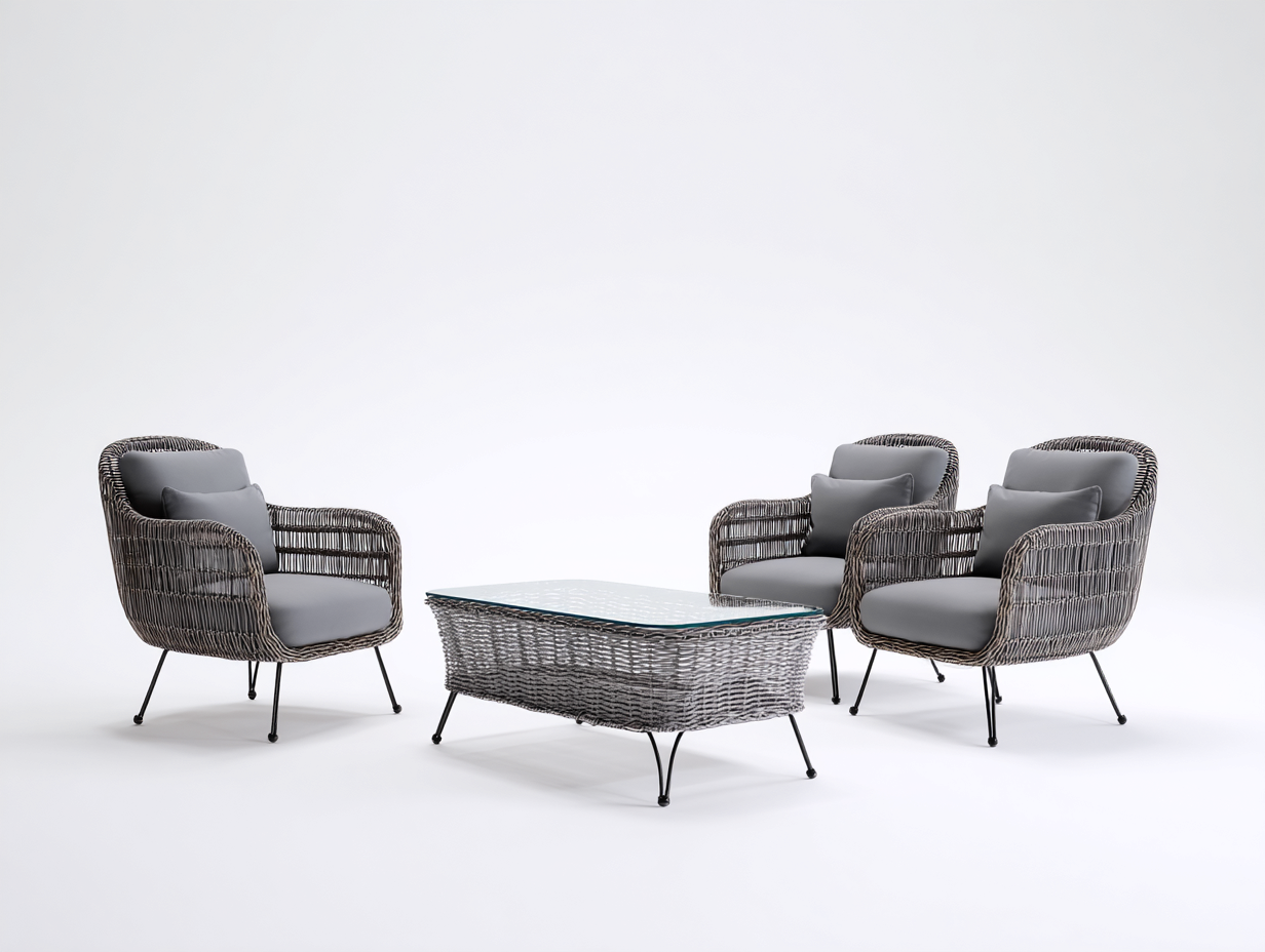Los sillones cuentan con estructura de acero resistente que proporciona estabilidad durante el uso. El exterior está recubierto con ratán trenzado en color gris que aporta una textura natural característica del mobiliario exterior. La mesa central incorpora una base de ratán y un tablero de vidrio que ofrece una superficie firme y fácil de limpiar para el uso diario. Las superficies de asiento presentan tejido acolchado en color gris adecuado para espacios exteriores.